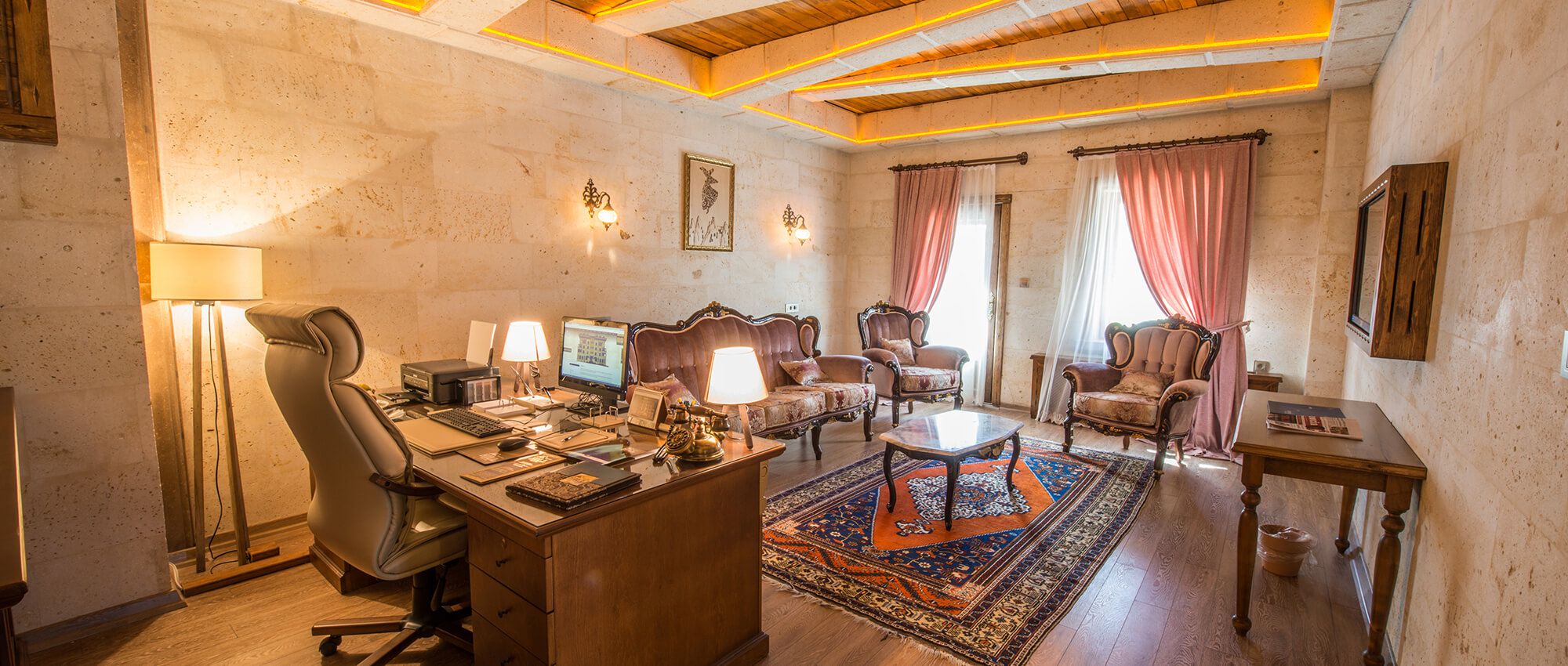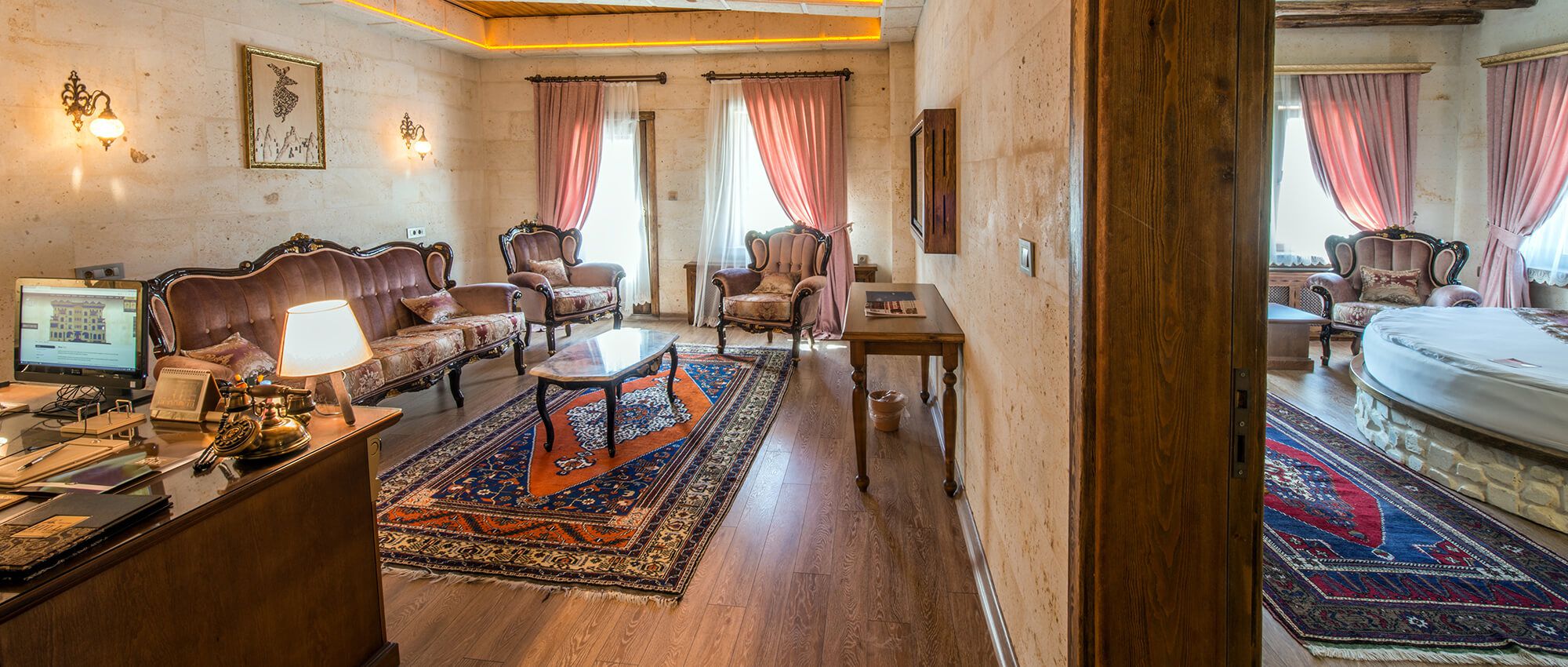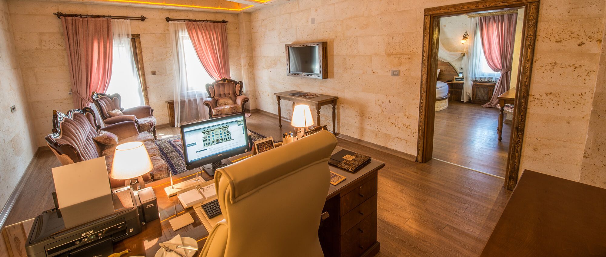 The ultra-spacious King Business Suite offers a comfortable furnished with antique furnitures. The bedroom and living room are located separately. This luxurious bathroom have spa jacuzzi and rainforest shower. The sitting room has a work desk, ergonomic business chair, computer and printer. This suite designed for business purposes. Both the bedroom and the living room have a television. This luxurious suite features Iphone / Ipod compatible music player, digital alarm and coffee machine with capsules. Coffee classics such as Espresso Brasil, Cafe Creme and El Salvador capsules are ready to use. Enjoy luxury and elegance with L’occitane brand toiletries. In your room with Interactive Smart TV system you can watch movies and Soap Movies on Netflix, browse tours, activities, surf the internet and order room service and special requests on TV.
