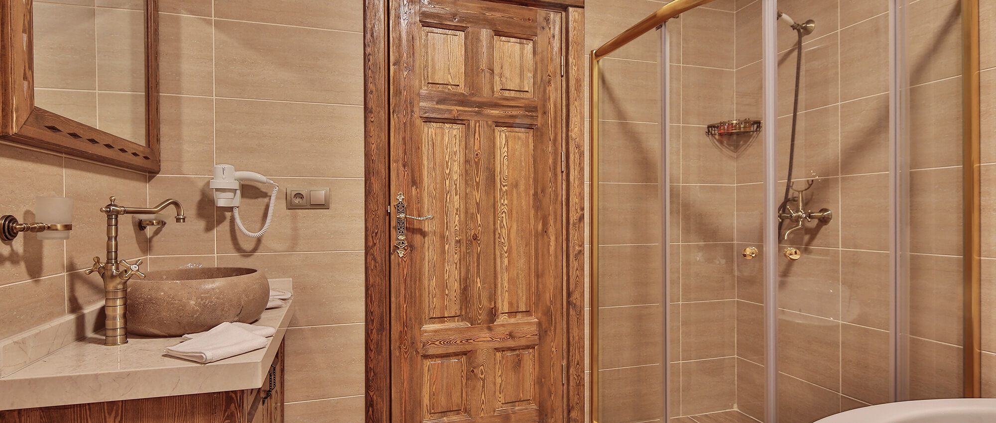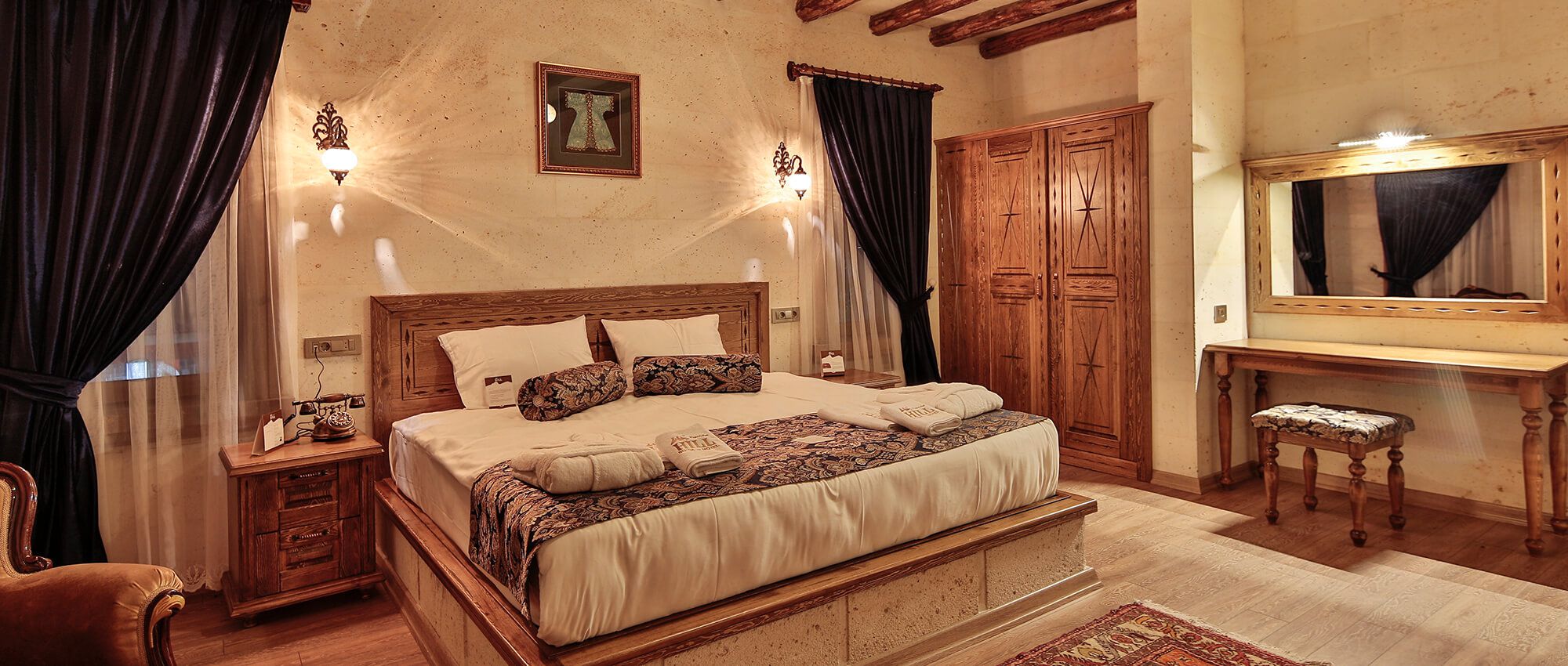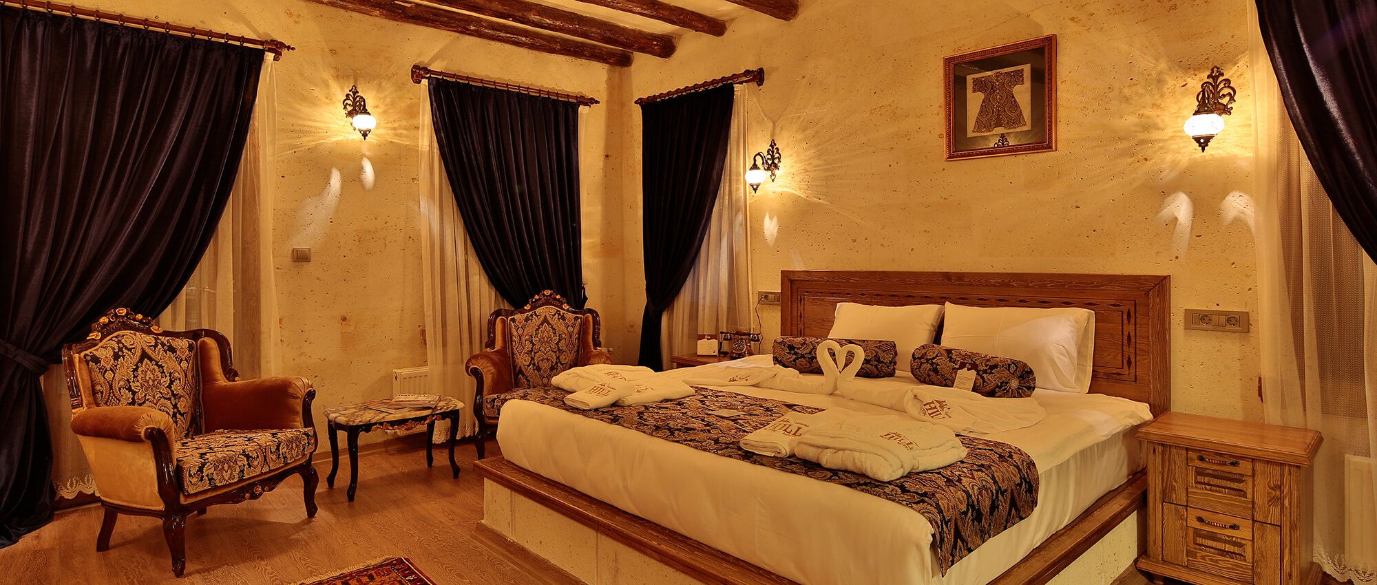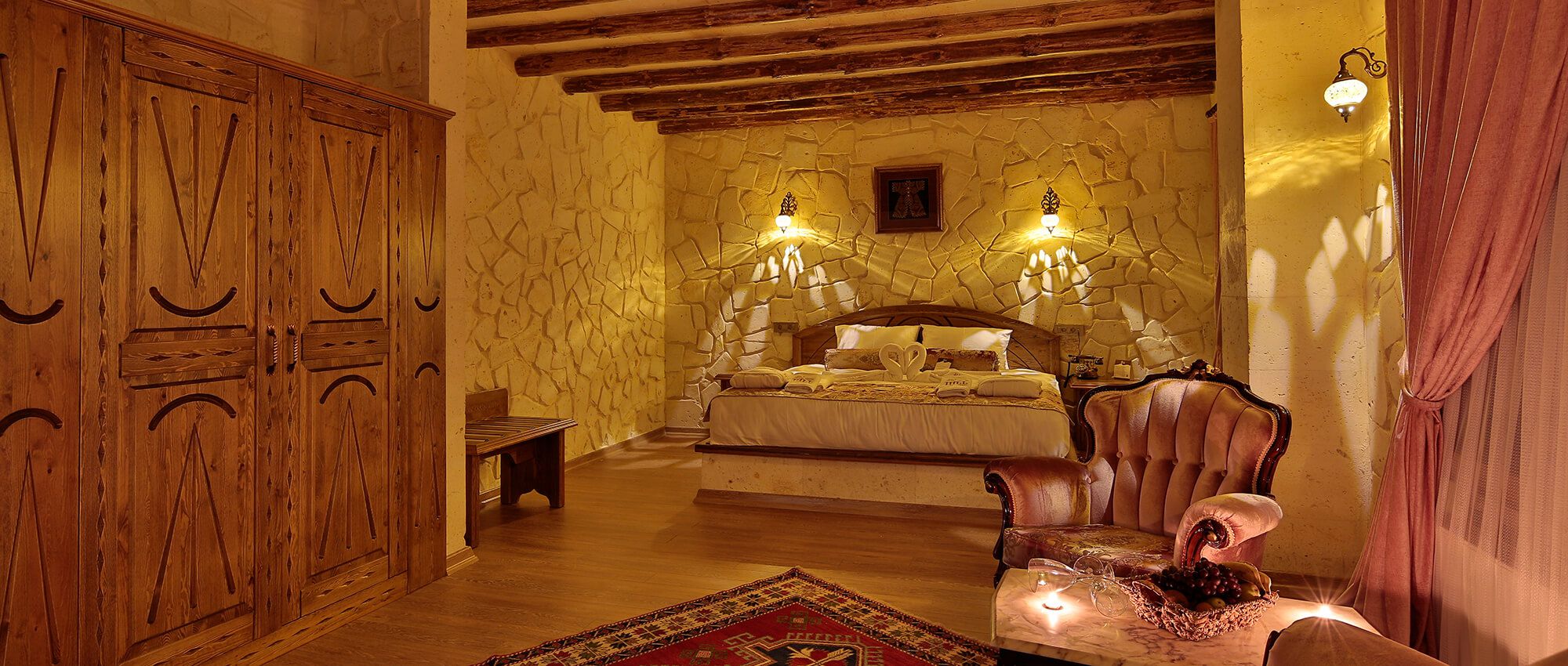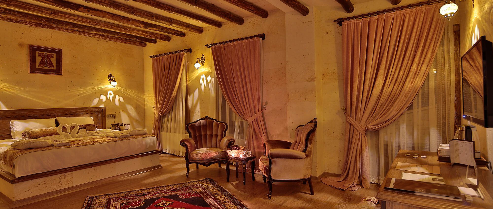 Premium Cave Suite with a unique atmosphere is blended with historical elements and has an ostentatious fireplace. This luxurious suite is located within 10 meters of the ground with hand carved rocks and equipped with spa jacuzzi, toilet, shower and hairdryer. This luxurious suite features an Iphone / Ipod compatible music player, a digital alarm clock and a coffee machine with a capsules. Coffee classics such as Espresso Brasil, Cafe Creme and El Salvador capsules are ready to use. Enjoy luxury and elegance with L’occitane brand toiletries. In your room with Interactive Smart TV system you can watch movies and Soap Movies on Netflix, browse tours, activities, surf the internet and order room service and special requests on TV.